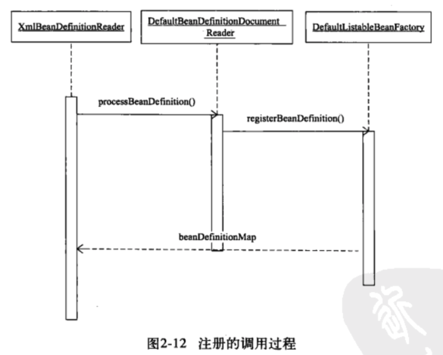 将解析得到的BeanDefinition向IOC容器中的map注册的过程是在载入BeanDefinition完成后进行的,调用过程如下: