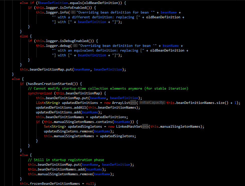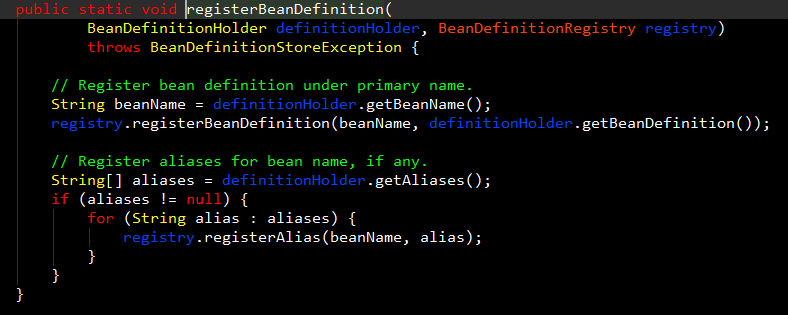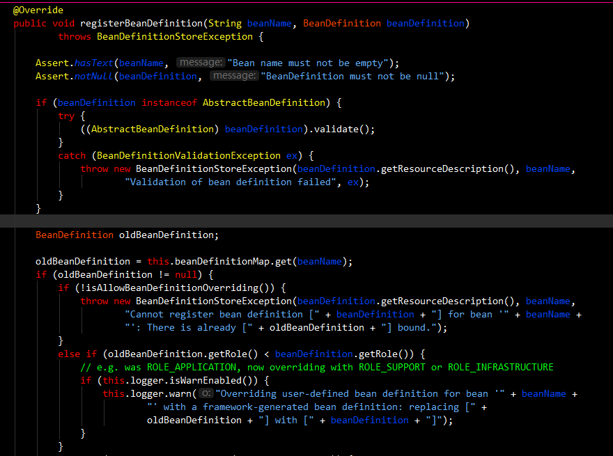 调用了注入的registry(即DefaultListableBeanFactory): 看DefaultListableBeanFactory中的registerBeanDefinition方法: