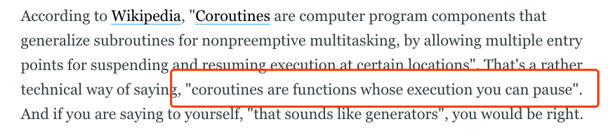 一些有先见之明的前辈想到,如果我们能够利用生成器能够暂停的这一特性,然后想办法添加 send stuff back 的功能,这不就符合维基百科对于协程的定义了么?