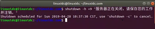 linuxidc@linuxidc:~/linuxidc.com$ shutdown -h +9 "服务器正在关闭,请保存您的工作并注销。" Shutdown scheduled for Sun 2019-04-28 10:37:30 CST, use 'shutdown -c' to cancel. 请记住,您可以找到这些命令的开关的完整列表,输入: