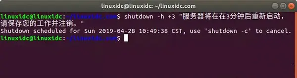 linuxidc@linuxidc:~/linuxidc.com$ shutdown -h +3 "服务器将在在3分钟后重新启动, 请保存您的工作并注销。" Shutdown scheduled for Sun 2019-04-28 10:49:38 CST, use 'shutdown -c' to cancel. 可以通过输入shutdown -c命令取消任何计划的关闭或重新启动: