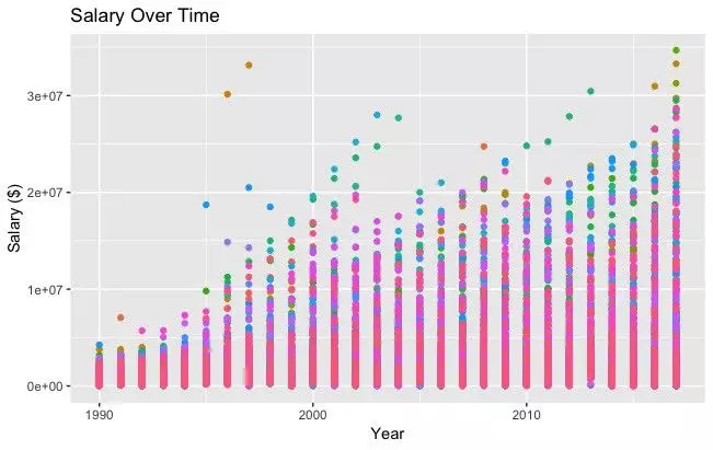 #All Salariesggplot(data=df, aes(x=season_start, y=salary, colour=team)) + geom_point() + theme(legend.position="none") + labs(title = 'Salary Over Time', x='Year', y='Salary ($)')