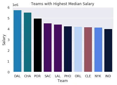 import seaborn as snsimport matplotlib.pyplot as pltcolor_order = ['xkcd:cerulean', 'xkcd:ocean', 'xkcd:black','xkcd:royal purple', 'xkcd:royal purple', 'xkcd:navy blue', 'xkcd:powder blue', 'xkcd:light maroon', 'xkcd:lightish blue','xkcd:navy']sns.barplot(x=top10.Team, y=top10.Salary, palette=color_order).set_title('Teams with Highest Median Salary')plt.ticklabel_format(style='sci', axis='y', scilimits=(0,0))
