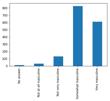 import pandas as pdfrom bokeh.plotting import figurefrom bokeh.io import show# is_masc is a one-hot encoded dataframe of responses to the question:# "Do you identify as masculine?"#Dataframe Prepcounts = is_masc.sum()resps = is_masc.columns#Bokehp2 = figure(title='Do You View Yourself As Masculine?', x_axis_label='Response', y_axis_label='Count', x_range=list(resps))p2.vbar(x=resps, top=counts, width=0.6, fill_color='red', line_color='black')show(p2)#Pandascounts.plot(kind='bar')