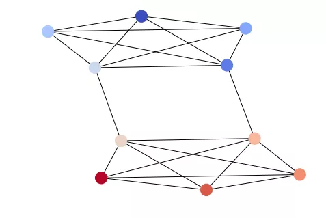 options = { 'node_color' : range(len(G)), 'node_size' : 300, 'width' : 1, 'with_labels' : False, 'cmap' : plt.cm.coolwarm}nx.draw(G, **options)