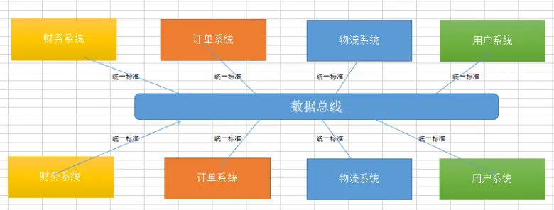 相关概念 : 统一标准——各系统的协议、地址、交互方式。 新的交互方式:各个系统分别根据统一标准向数据总线进行注册,各子系统调用其他子系统时,我们并不关心如果找到其他子系统,我们只找数据总线,数据总线再根据统一标准找其他子系统,所以数据总线在这里充当一个只路人的作用。