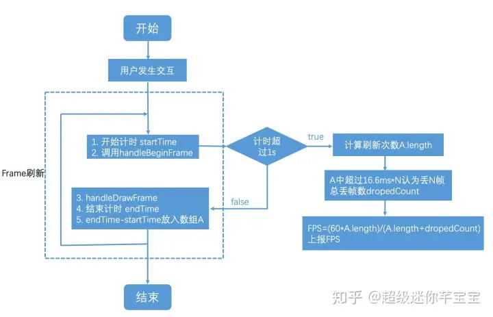 handleDrawFrame: Called by the engine to produce a new frame.通过计算handleBeginFrame和handleDrawFrame之间的时间间隔计算帧率,主要流程如下图: