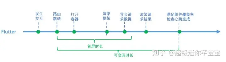 在概念上Flutter和weex的首屏时长和可交互时长并不完全一致,Flutter之所以选择从路由跳转开始计算时长主要是因为这种计算方式更贴近用户体验,可以获取更多的问题信息,比如路由跳转的时长问题等。