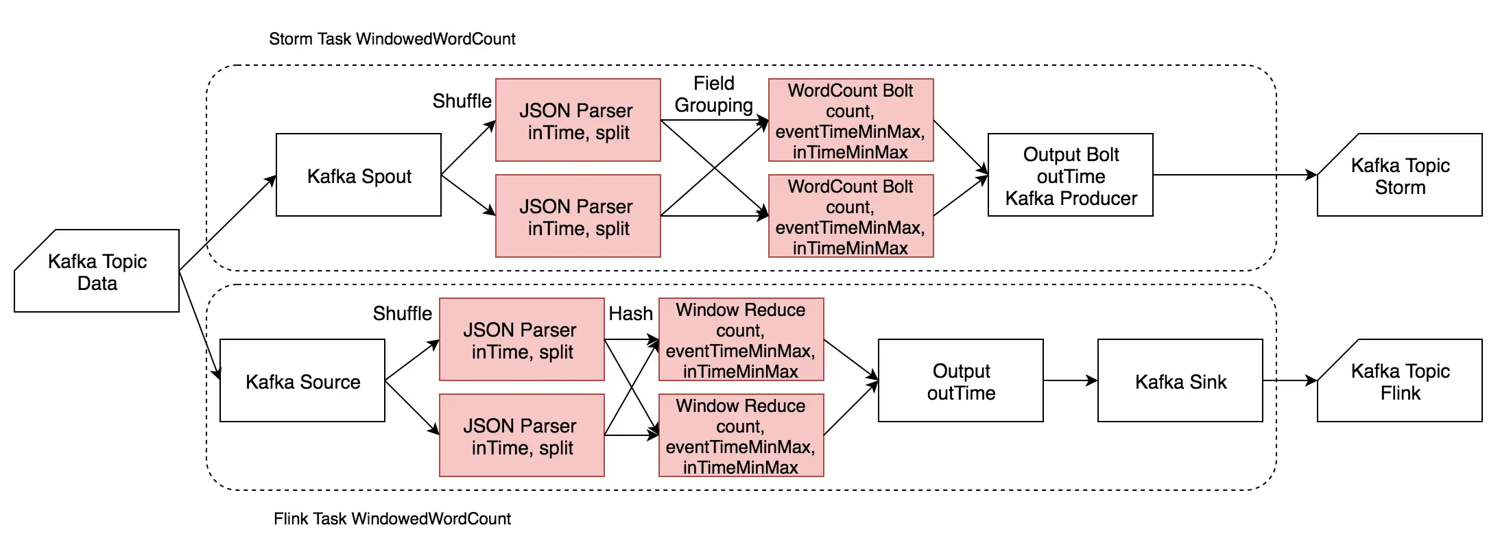 Storm Task 和 Flink Task (每个测试用例不同)从 Kafka Topic Data 相同的 Offset 开始消费,并将结果及相应 inTime、outTime 时间戳分别写入两个 Topic(Topic Storm 和 Topic Flink)中。