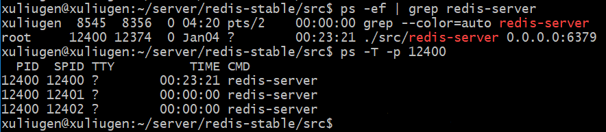 警告1:这里我们一直在强调的单线程,只是在处理我们的网络请求的时候只有一个线程来处理,一个正式的Redis Server运行的时候肯定是不止一个线程的,这里需要大家明确的注意一下!例如Redis进行持久化的时候会以子进程或者子线程的方式执行(具体是子线程还是子进程待读者深入研究);例如我在测试服务器上查看Redis进程,然后找到该进程下的线程: