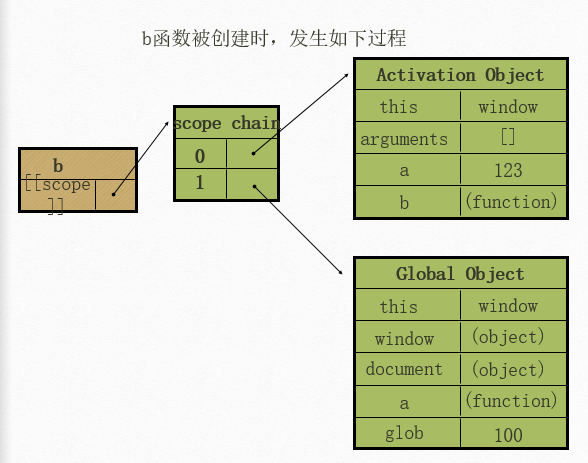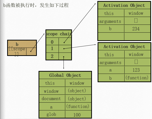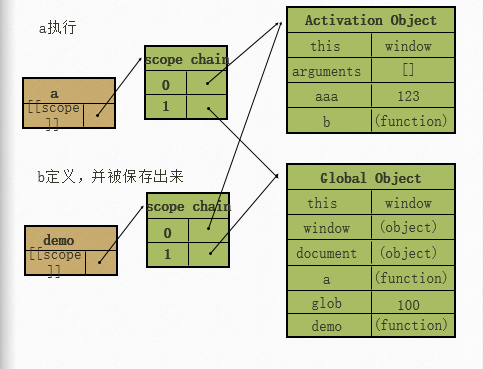 [[scope]]:每个javascrip函数都是一个对象,对象中有些属性我们可以访问,有些不可以,这些属性仅供javascript引擎存取,[[scope]]就是其中一个。[[scope]]指的就是我们所有的作用域,其中存储了运行期上下文的集合。