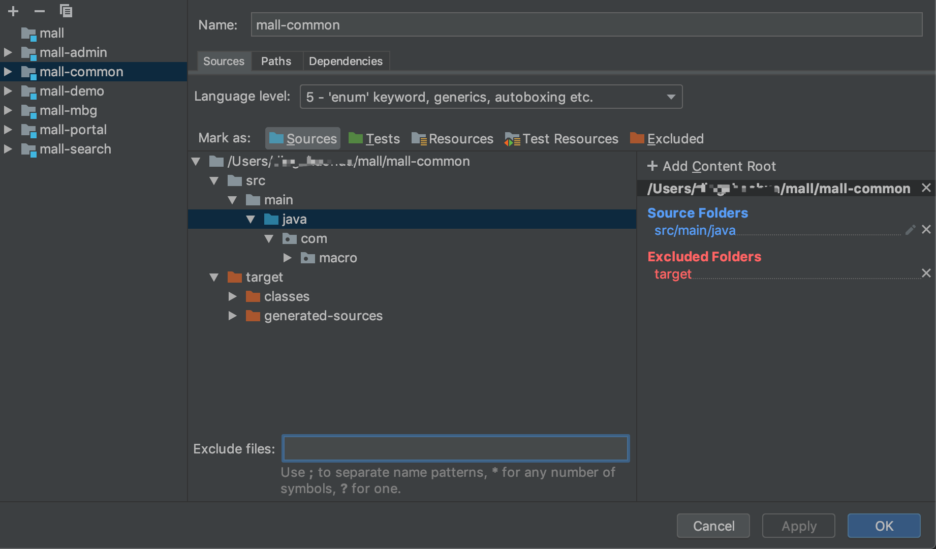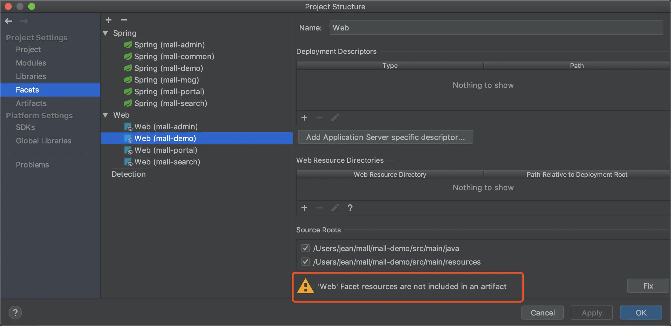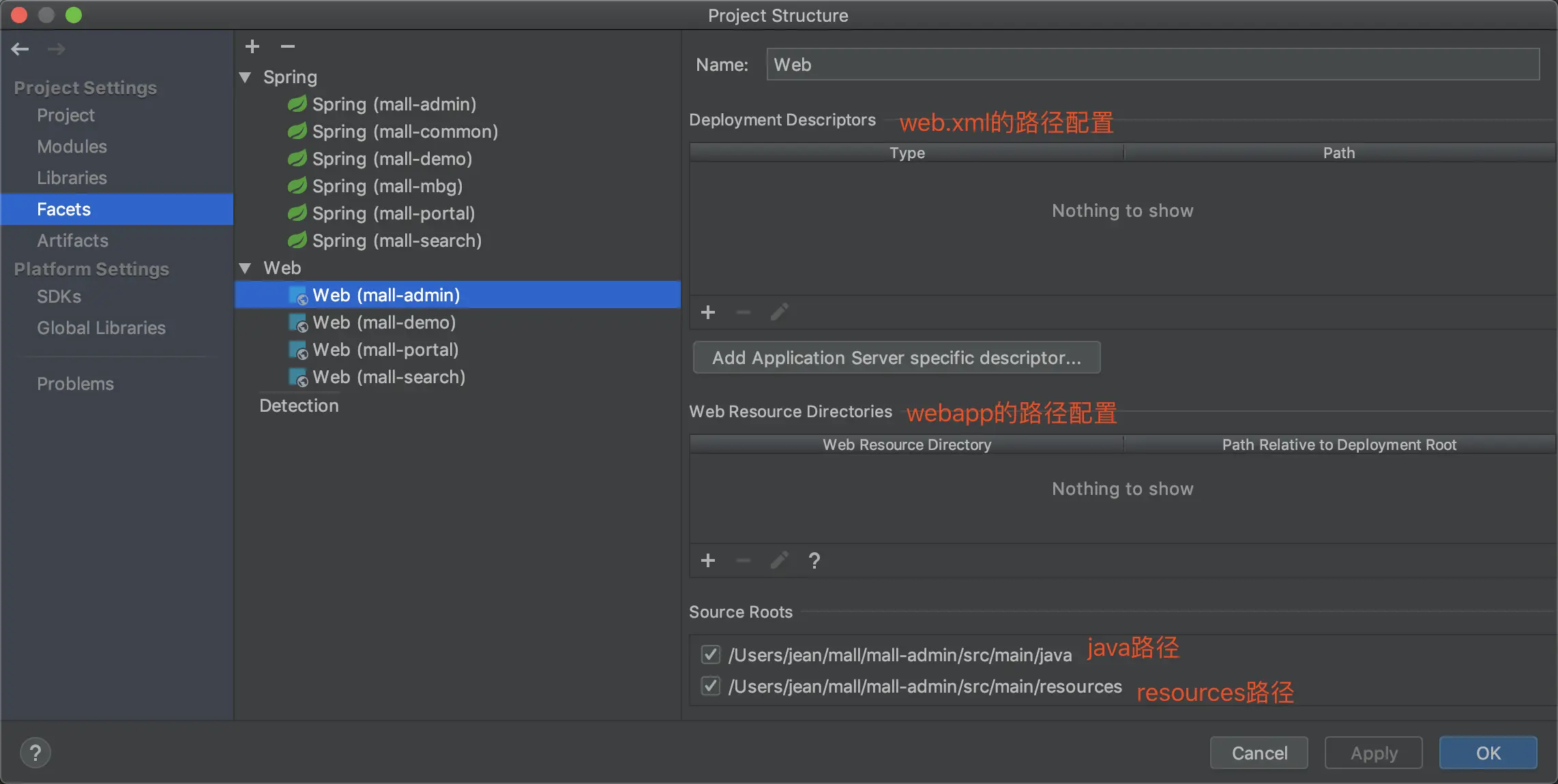 - Facets (确认信息,比如源码放在哪里、相关资源(图片等)在哪里放、JavaWeb程序的root路径等)