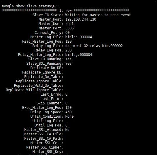 - 查看slave的状态,如果下面两项值为YES,则表示配置正确: Slave_IO_Running: Yes Slave_SQL_Running: Yes