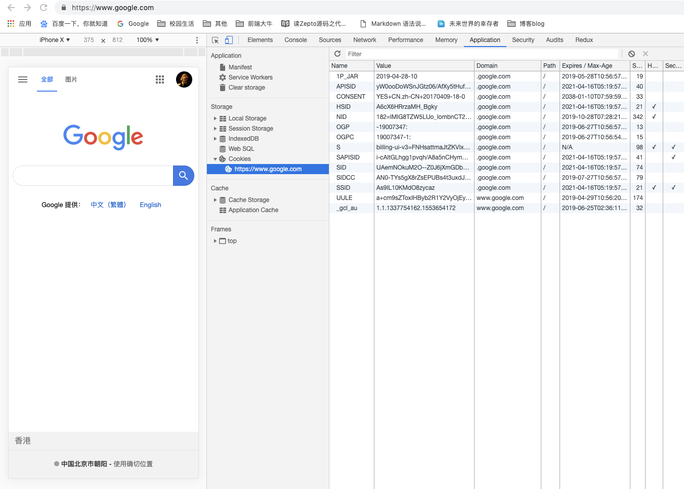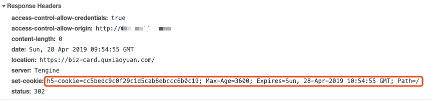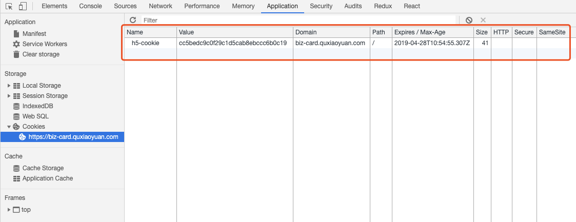 就像上图所示,在响应头中有了Set-Cookie,并设置了服务端返回的相应的值,这个时候我们在查看当前页面的Application中的cookie,发现其中已经有了刚才返回的cookie。会话cookie一般不会存储在硬盘里,而是保存在内存中,如果是设置了过期时间,浏览器会把cookie保存在硬盘中。