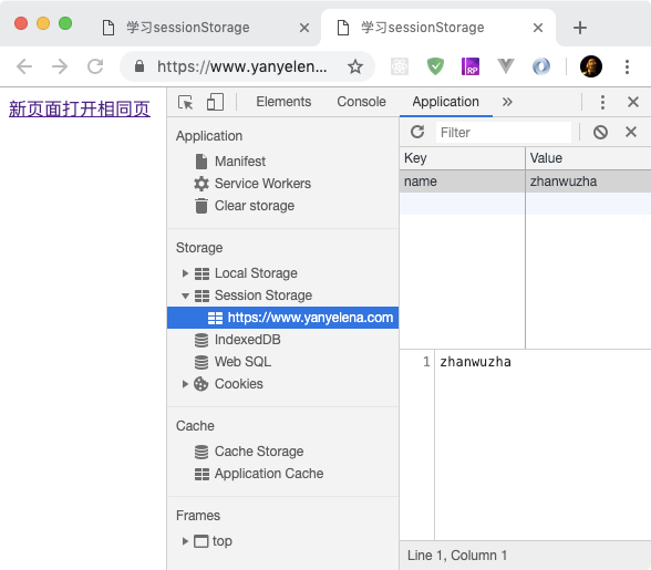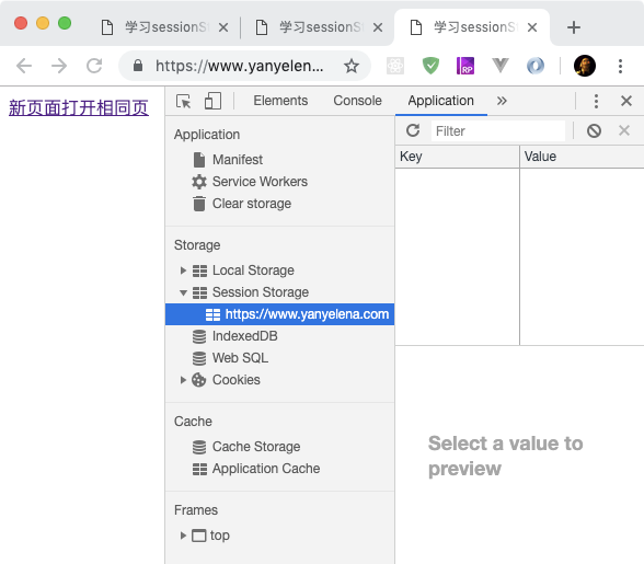 我们打开新标签页的sessionStorage中依然有我们刚才保存的数据,可是如果我们直接在地址栏输入地址呢