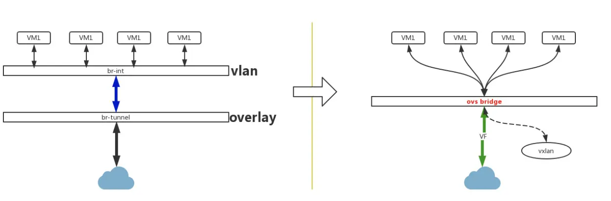 在我们的模型中,把两个网桥整合为一个网桥,将vxlan⼝和vhost-user的⼝都放到⽤⼀个网桥上。VM发出的报⽂经过OVS转发处理后,携带外层头信息进入vxlan驱动,经过vxlan网口的封装后,发送给VF网口。