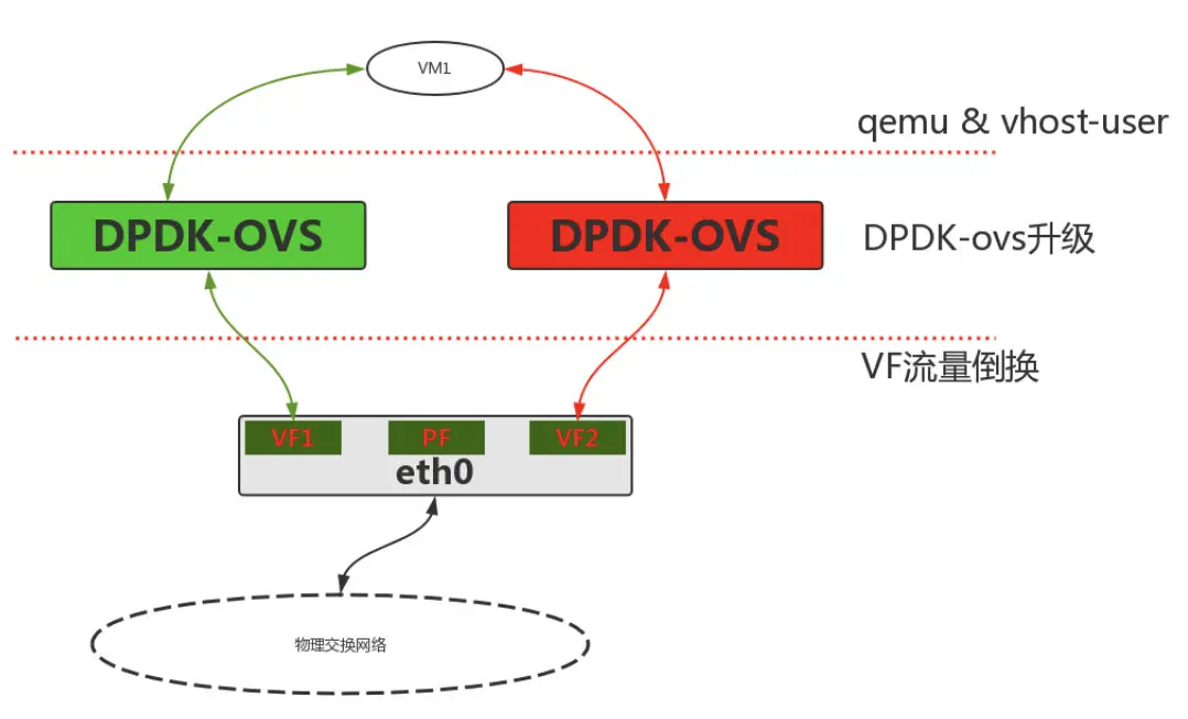 我们热升级的模型中采⽤的是两个独⽴的OVS-DPDK进程,因此提前启动一个新的OVS-DPDK进程作为后备进程,这个进程完成所有热升级相关的初始化,比如初始化vf2。这样当原有OVS-DPDK进程Crash后,新的进程可以做快速的切换,实验室环境下,单VM测试可以做到跟热升级时间差不多。