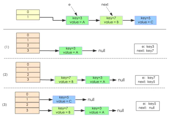 线程一被调度回来执行,先是执行 newTalbe[i] = e, 然后是e = next,导致了e指向了key(7),而下一次循环的next = e.next导致了next指向了key(3)。
