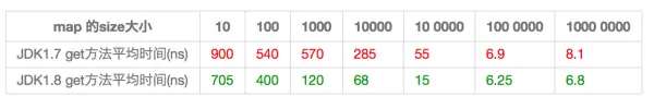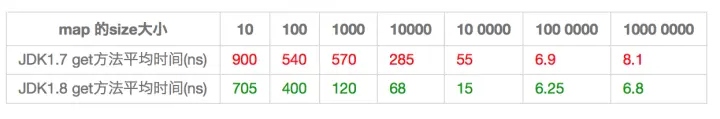 HashMap中,如果key经过hash算法得出的数组索引位置全部不相同,即Hash算法非常好,那样的话,getKey方法的时间复杂度就是O(1),如果Hash算法技术的结果碰撞非常多,假如Hash算极其差,所有的Hash算法结果得出的索引位置一样,那样所有的键值对都集中到一个桶中,或者在一个链表中,或者在一个红黑树中,时间复杂度分别为O(n)和O(lgn)。 鉴于JDK1.8做了多方面的优化,总体性能优于JDK1.7,下面我们从两个方面用例子证明这一点。