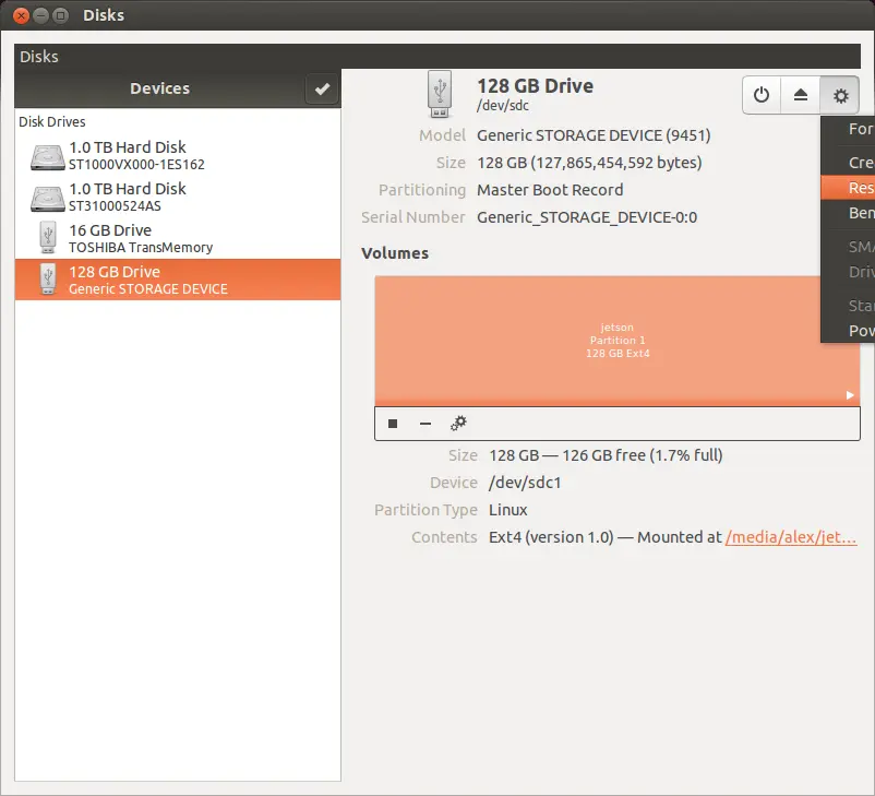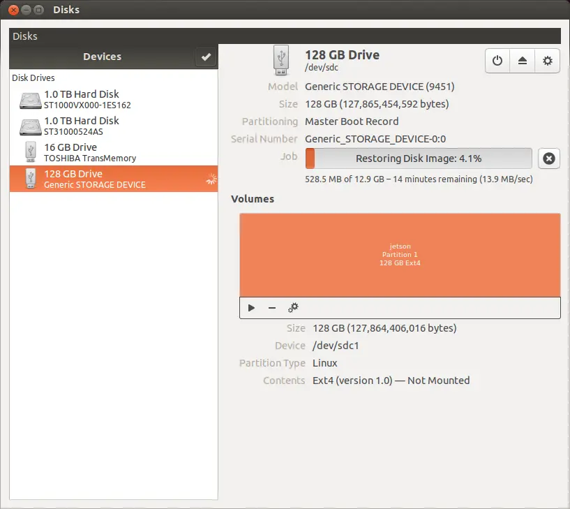 镜像下载完毕后,解压,然后将镜像写入SD卡。在Ubuntu系统下,使用系统自带Disks工具即可。打开Disks应用程序,点击右上角的More actions图标,选择Restore Disk Image...