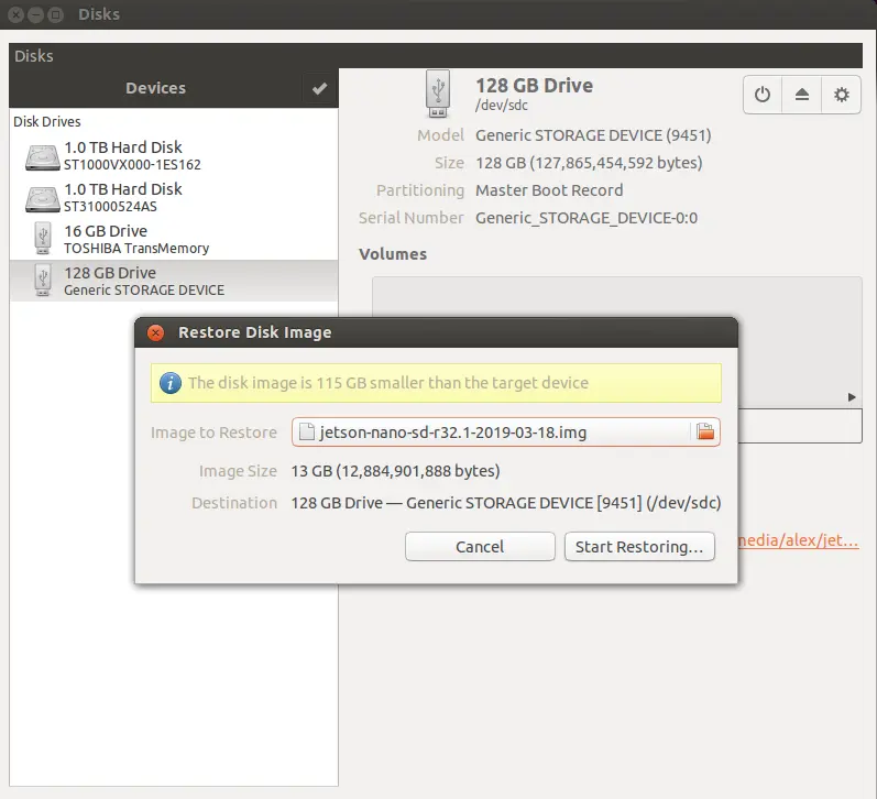 Image to Restore选择上一部解压出来的镜像文件,然后点击*Start Restoring...*按钮。