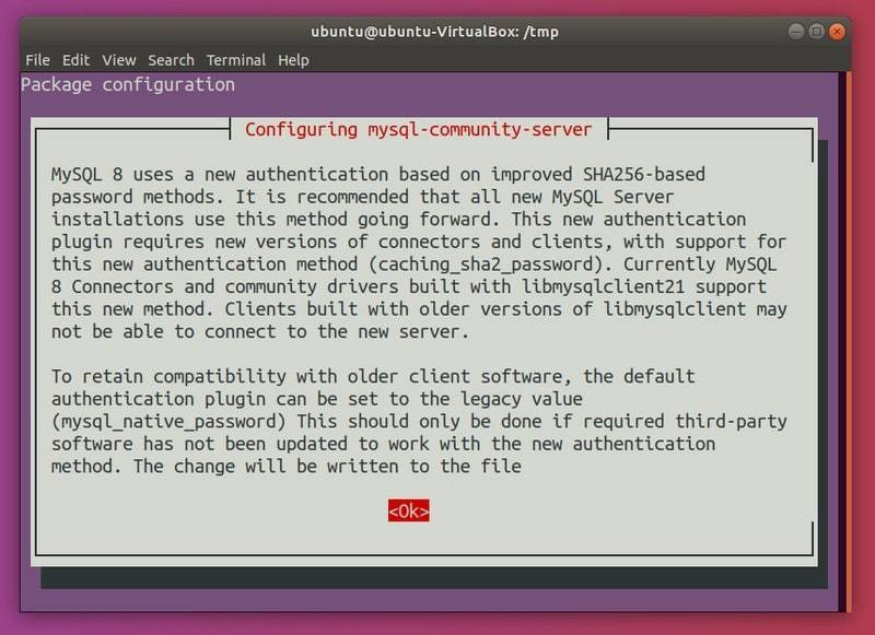 https://dev.mysql.com/get/mysql-apt-config_0.8.12-1_all.deb 是我刚刚从网页上复制的链接。根据当前的 MySQL 版本,它有可能不同。让我们使用 dpkg 去开始安装 MySQL: