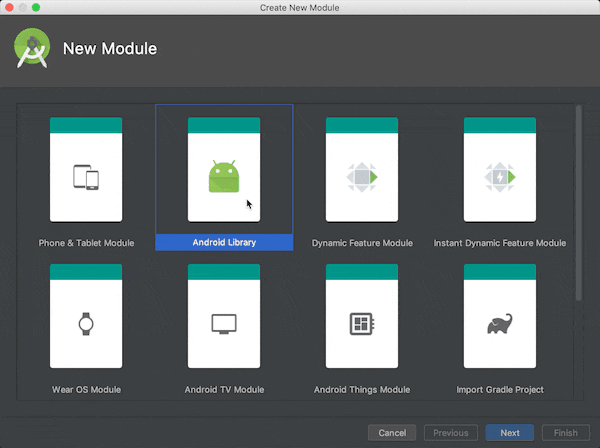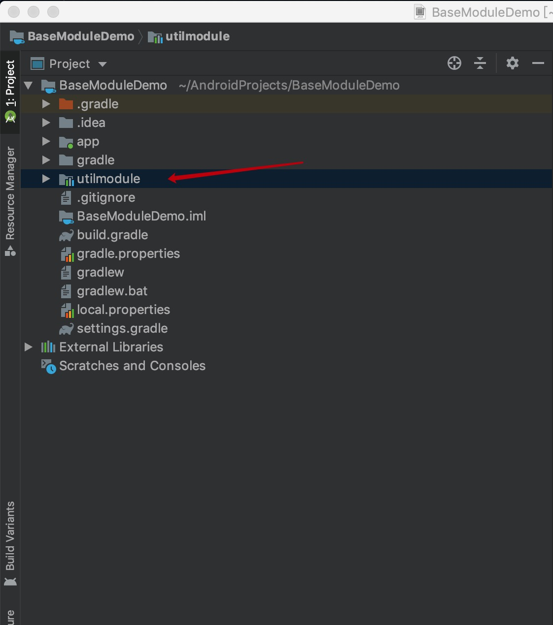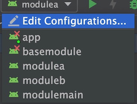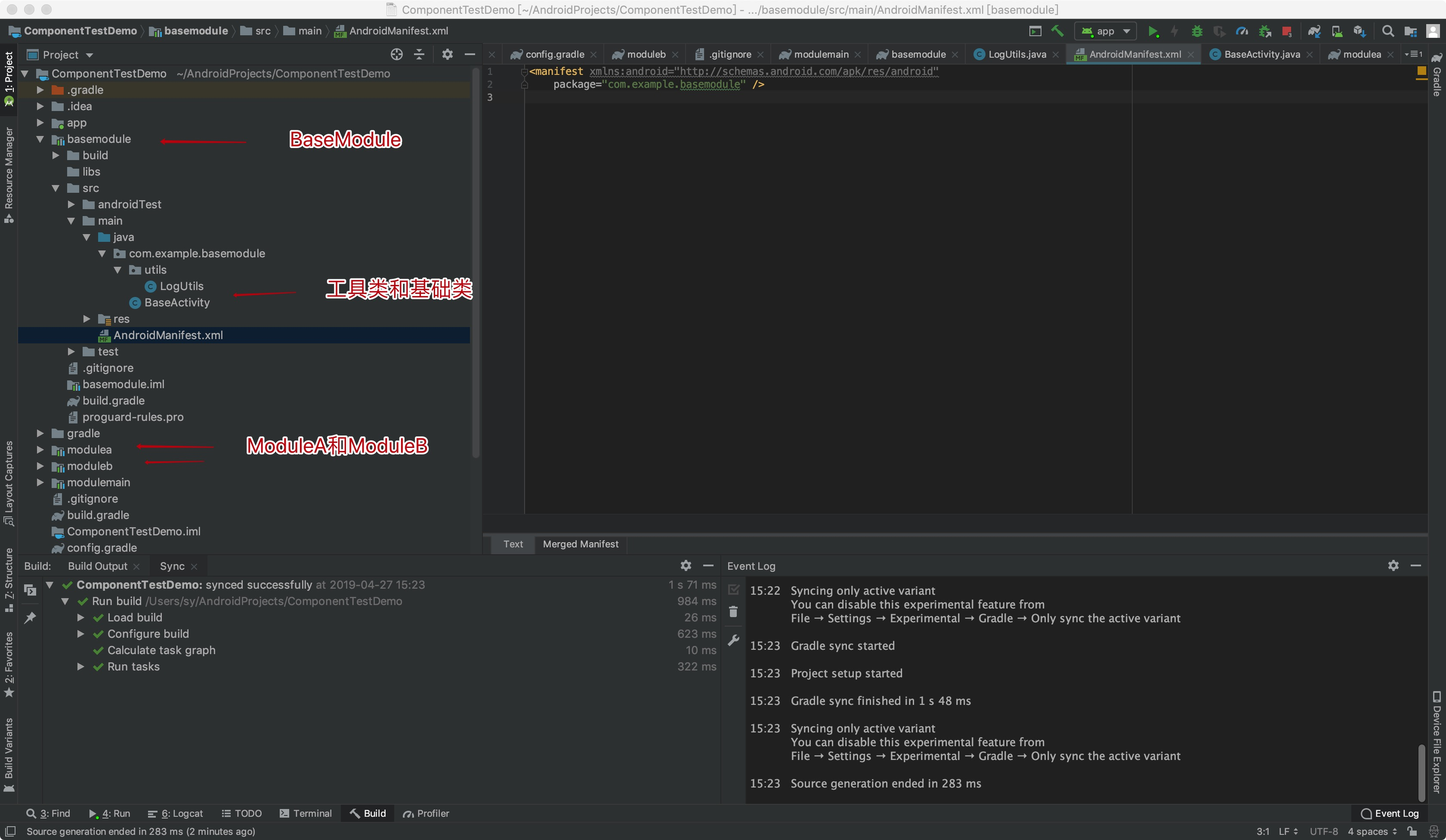 接着按照新建ModuleMain的步骤重复新建其他业务Module,这里我新建了3个Module,业务A:ModuleA与业务B:ModuleB和一个BaseModule。其中BaseModule主要存放一些基础类和工具类,只做为Module为上层业务模块提供服务。