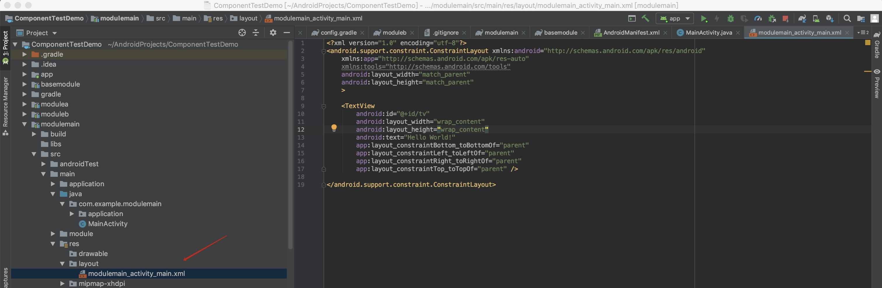 我们知道组件化中需要一个app壳工程,这个壳工程中不处理任何业务,就只是一个空壳,由它将所需要的各个组件模块组合起来,构成一个完整的应用。而现在项目中的app还是存在默认的入口Activity的,所以要新建一个ModuleMain将默认的MainActivity和其布局文件搬过去。