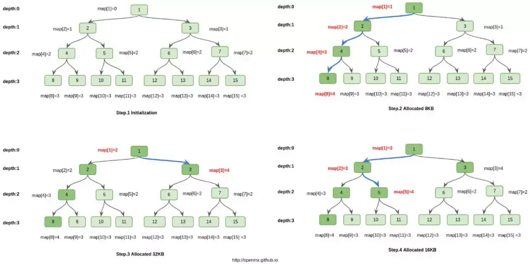 思路其实不是特别难,但是Netty中用各种二进制优化之后,显的不那么容易理解。所以,我画了一副图。其本质就是,完全二叉树的每个节点id都维护一个map[id]值,这个值表示以id为根的子树上,按照层次遍历,第一个完全空闲子树对应根节点的深度。例如在step.3图中,id=2,层次遍历碰到的第一颗完全空闲子树是id=5为根的子树,它的深度为2,所以map[2]=2。