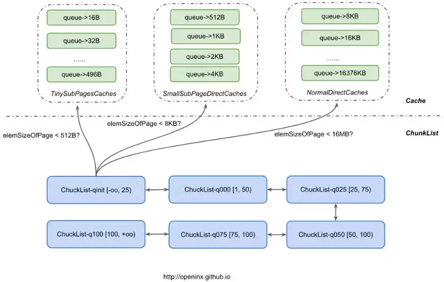 当然,Cache又按照Page内部划分量(称之为elemSizeOfPage,也就是一个Page内会划分成8KB/elemSizeOfPage个相等大小的小块)分成3个不同类型的Cache。对那些小于512B的申请请求,将尝试去TinySubPagesCaches中申请;对那些小于8KB的申请请求,将尝试去SmallSubPagesDirectCaches中申请;对那些小于16MB的申请请求,将尝试去NormalDirectCaches中申请。若对应的Cache中,不存在能用的内存,则直接去下面的6个ChunkList中找Chunk申请,当然这些Chunk有可能都被申请满了,那么只能向Offheap直接申请一个Chunk来满足需求了。
