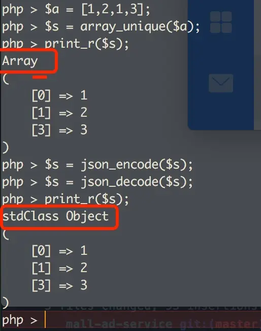 code为数组,array_unique 去重之后,变为不连续的索引数组,json之后会转变为对象。