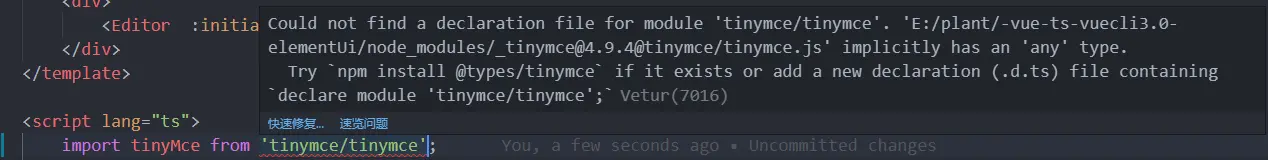解决方法:src目录下面新建一个shims-tinymce.d.ts文件