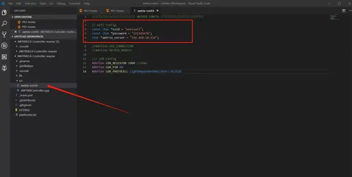第二步,打开根目录下 awtrix-conf.h 文件,修改 Wi-Fi 和服务器设置。ssid 填写 Wi-Fi 名,password 填写 Wi-Fi 密码,awtrix_server 填写自己 awtrix 服务器的 IP(不需要填端口)