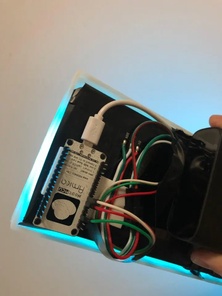 ESP8266 和像素屏幕用杜邦线连接(记住是接 DIN 的那三个,之前因为买错线接反的我 = =)。像素屏上的 DIN 接 ESP8266 上的 D2 口,像素屏 GND 接 ESP8266 的 GND,像素屏 5V 接 ESP8266 的 3V3(不要问为啥 3V3,其实 3v 的也可以)。如果你之前的做的是对的,这时应该就已经亮了,显示时间。(没亮也正常,多找找自己哪错了)