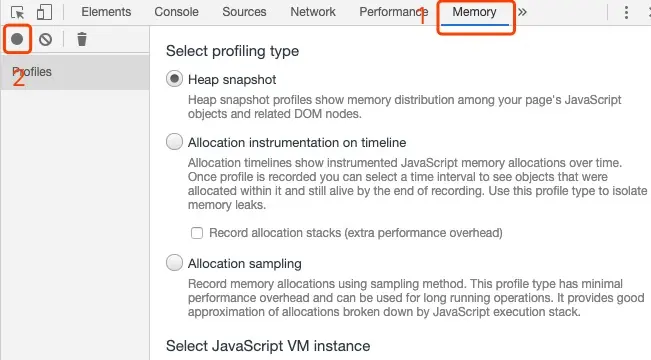 切换到 Memory 中,点击左侧的小圈圈就可以捕获当前的内存快照。