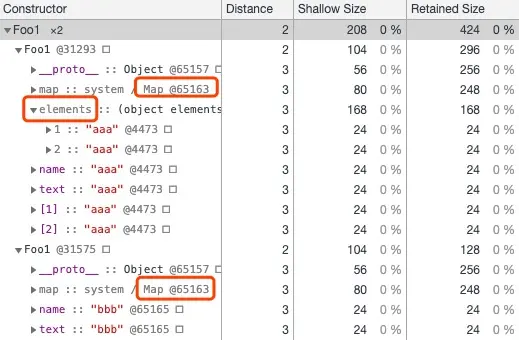 a、b 都有命名属性 name 和 text,此外 a 还额外多了两个可索引属性。从快照中可以明显的看到,可索引属性是存放在 Elements 中的,此外,a 和 b 具有相同的结构(这个结构会在下文中介绍)。