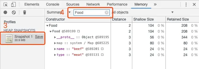 通过构造函数创建对象,主要是为了更方便地在快照中找到它。点开快照后,在过滤器中输入 Food 就可以找到由 Food 构造的所有对象了,神奇吧。