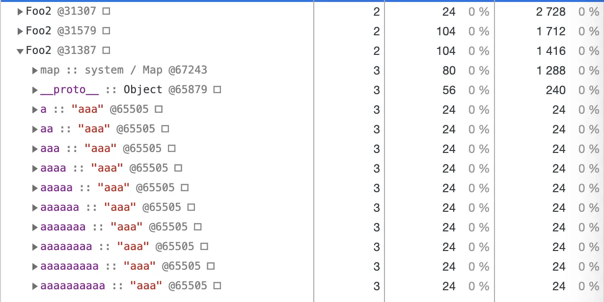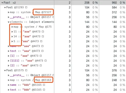 可以看到,此时隐藏类发生了变化,Element 中的数据存放也变得没有规律了。这是因为,当我们添加了 a[1111] 之后,数组会变成稀疏数组。为了节省空间,稀疏数组会转换为哈希存储的方式,而不再是用一个完整的数组描述这块空间的存储。所以,这几个可索引属性也不能再直接通过它的索引值计算得出内存的偏移量。至于隐藏类发生变化,可能是为了描述 Element 的结构发生改变(这个图片可以与下文中慢属性的配图进行比较,可以看到 Foo1 的 Property 并没有退化为哈希存储,只是 Element 退化为哈希存储导致隐藏类发生改变)。