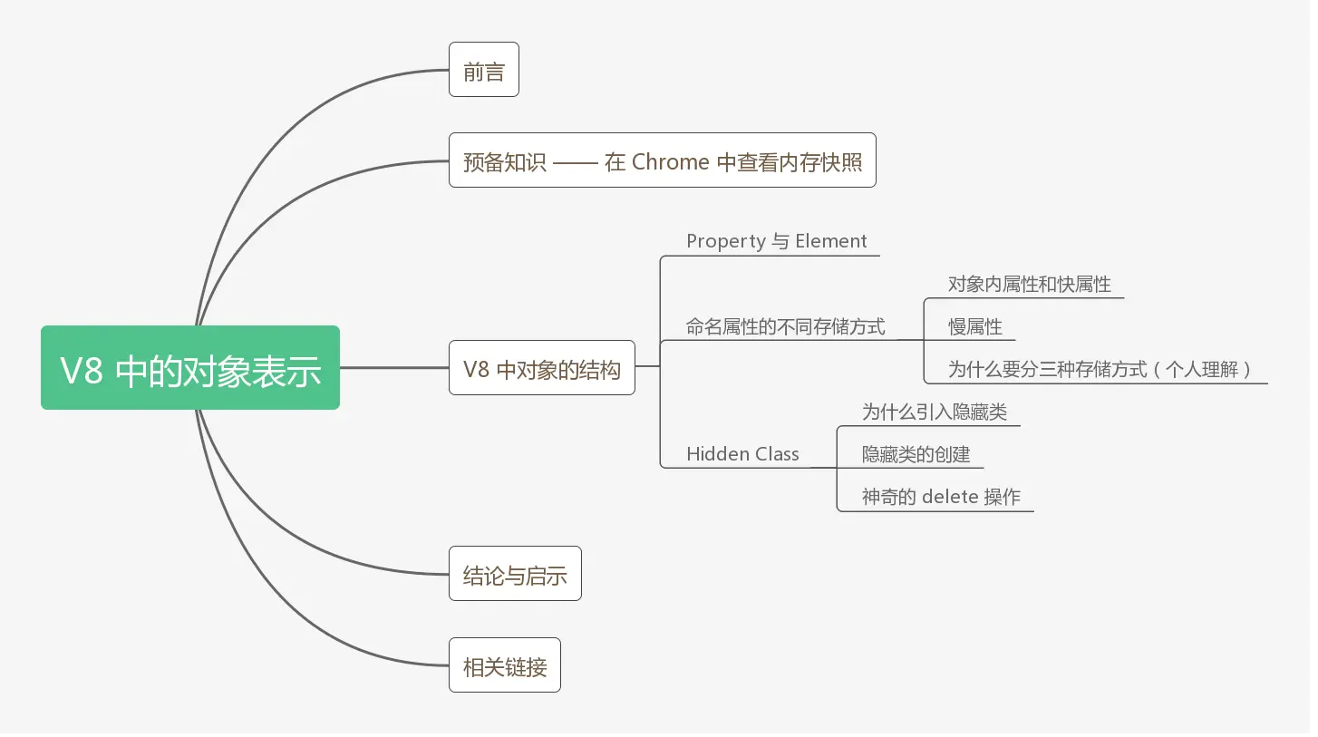 其中,隐藏类用于描述对象的结构。Property 和 Element 用于存放对象的属性,它们的区别主要体现在键名能否被索引。