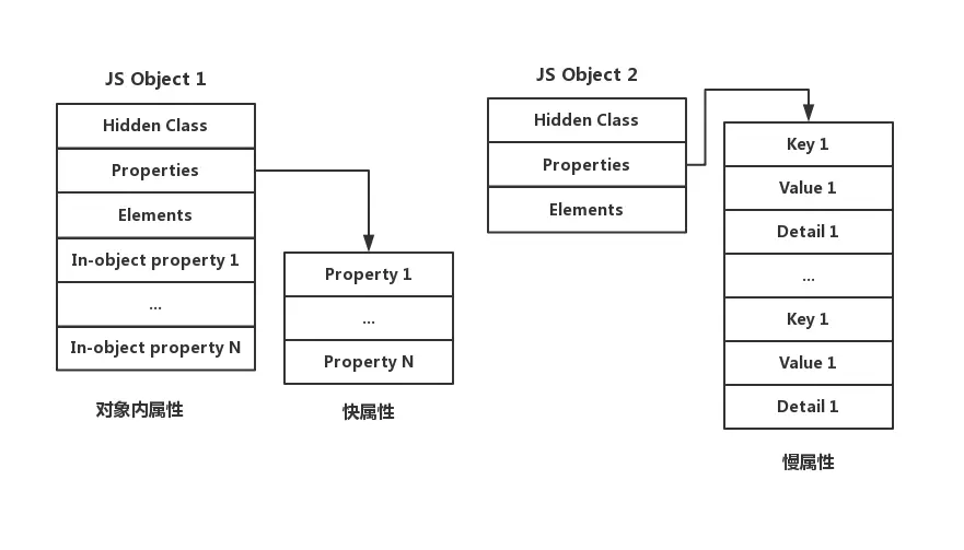 Properties中,可索引属性存放在Elements中。 - 命名属性有三种不同的存储方式:对象内属性、快属性和慢属性,前两者通过线性查找进行访问,慢属性通过哈希存储的方式进行访问。