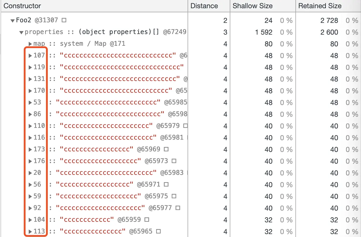 接着我们来看看 c。这个实在是太长了,只截取了一部分。可以看到,和 b (快属性)相比,properties 中的索引变成了毫无规律的数,意味着这个对象已经变成了哈希存取结构了。