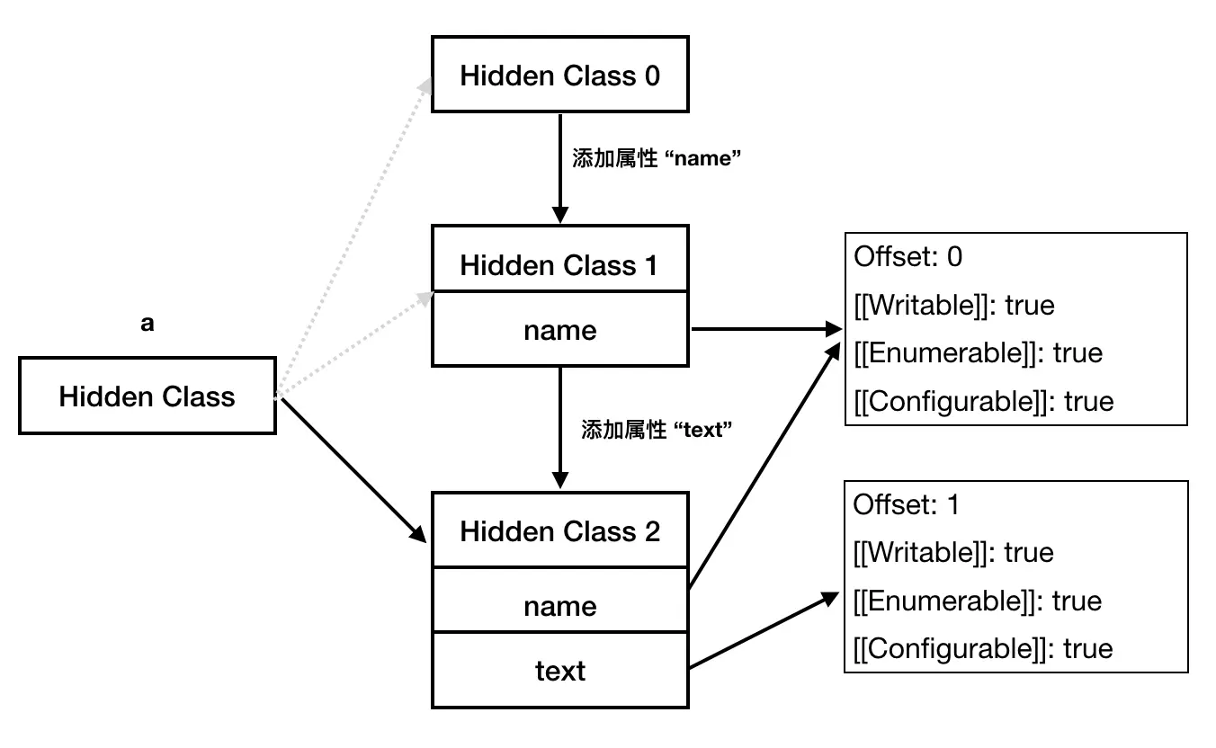 下面的例子中,a 在空对象时、添加 name 属性后、添加 text 属性后会分别对应不同的隐藏类。