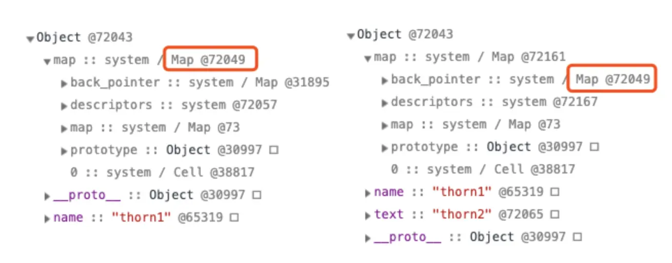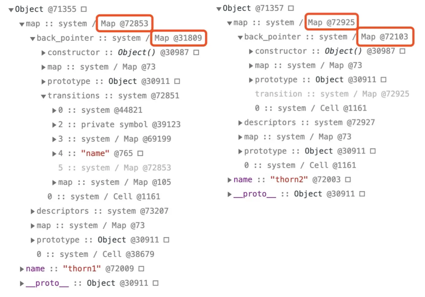 通过内存快照,我们也可以看到,Hidden Class 1 和 Hidden Class2 是不同的,并且后者的 back_pointer 指针指向前者,这也证实了上图中的流程分析。