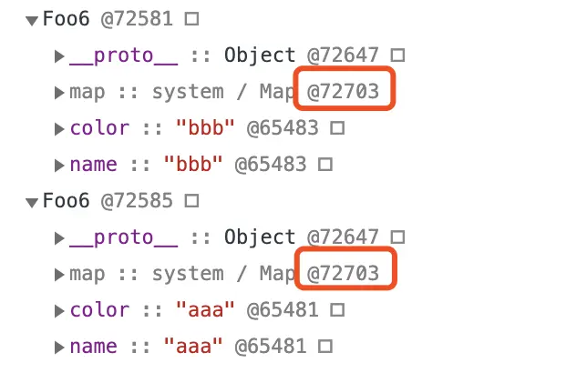 a 和 b 的区别是,a 首先创建一个空对象,然后给这个对象新增一个命名属性 name。而 b 中直接创建了一个含有命名属性 name 的对象。从内存快照我们可以看到,a 和 b 的隐藏类不一样,back_pointer 也不一样。这主要是因为,在创建 b 的隐藏类时,省略了为空对象单独创建隐藏类的一步。所以,要生成相同的隐藏类,更为准确的描述是 —— 从相同的起点,以相同的顺序,添加结构相同的属性(除 Value 外,属性的 Attribute 一致)。