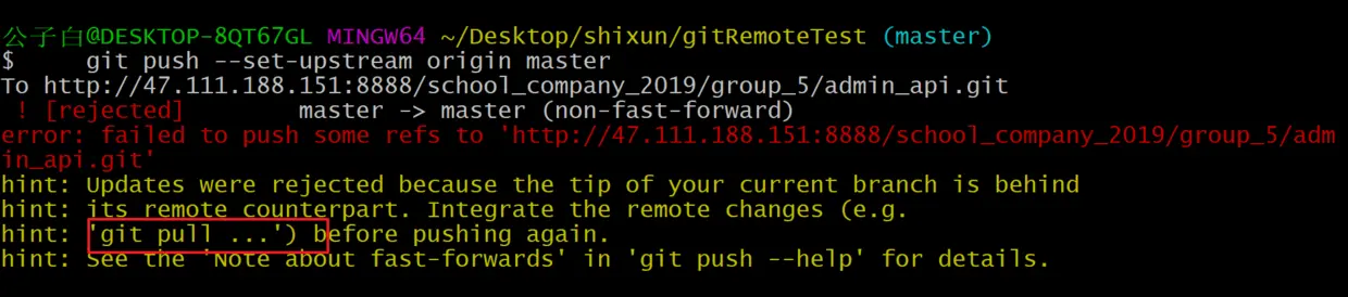 上面命令表示,将所有本地分支都推送到origin主机。如果远程主机的版本比本地版本更新,推送时Git会报错,要求先在本地做git pull合并差异,然后再推送到远程主机。这时,如果你一定要推送,可以使用–force选项。