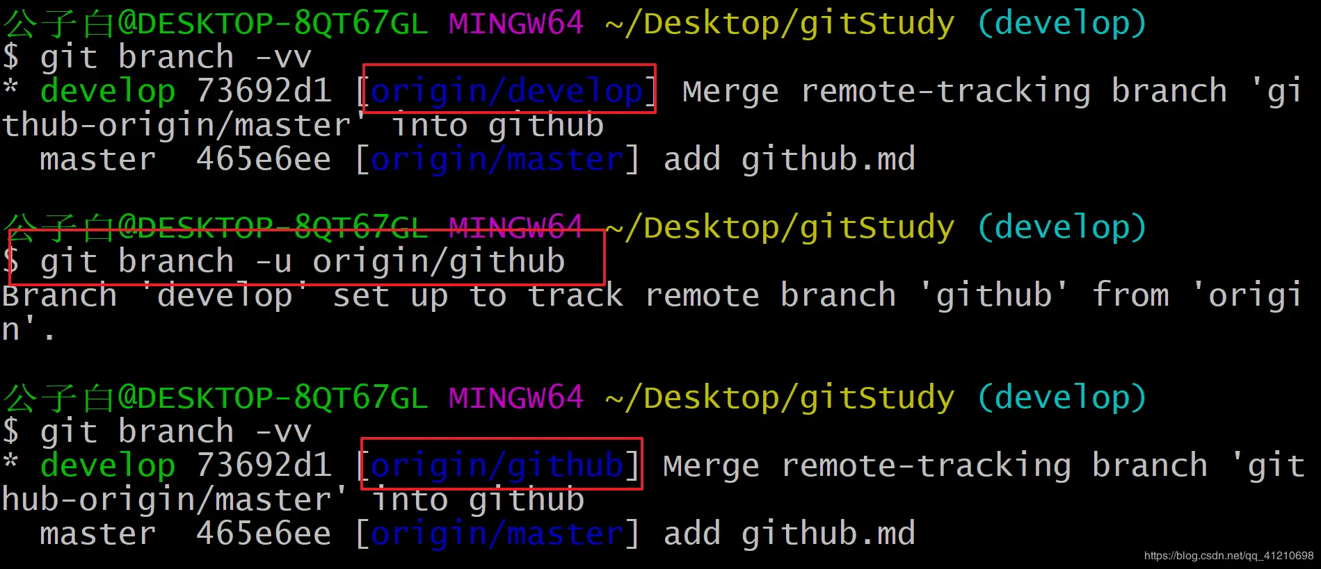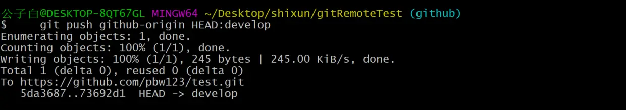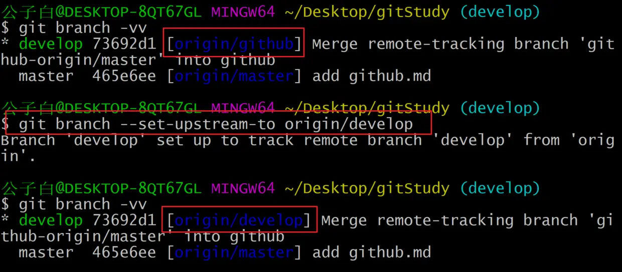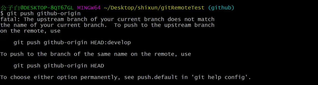 根本原因在于本地分支 github 是从远程分支develop拉取的,在执行git push命令时,不知道应该与远程哪个分支进行同步,就会出现上面那个错误 提示了两种解决方法 git push github-origin HEAD:develop 这种是将当前分支推送到github-origin仓库的develop分支 或者 git push github-origin HEAD 这种是将当前分支推送到远程的同名分支,没有就会创建 git rebase变基 设置已有的本地分支跟踪一个刚刚拉取下来的远程分支,或者想要修改正在跟踪的上游分支,你可以在任意时间使用 -u 或 --set-upstream-to 选项运行 git branch 来显式地设置。