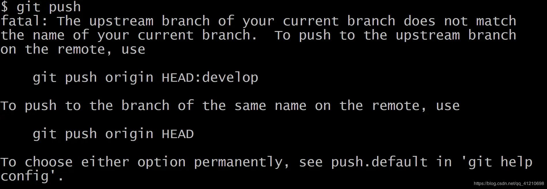 原因是本地的分支跟远程的分支名字不一样 git push origin HEAD:develop 的意思是将当前分支推送到origin的develop分支 git push origin HEAD 的意思是将当前分支推送到origin仓库与本地当前分支的同名分支,没有就会新建