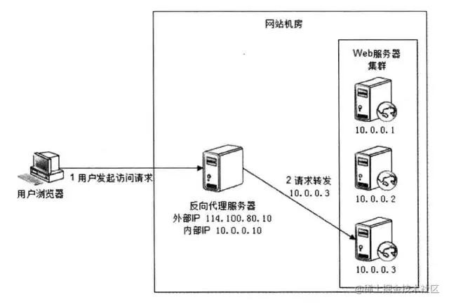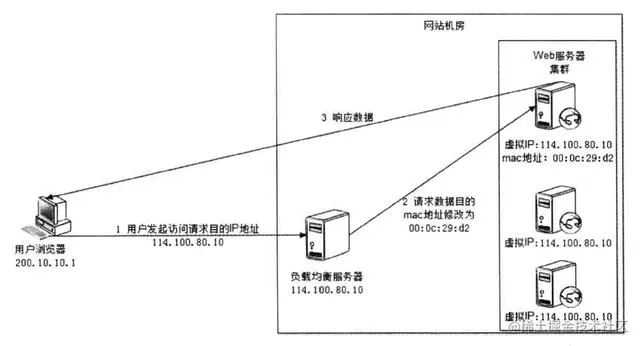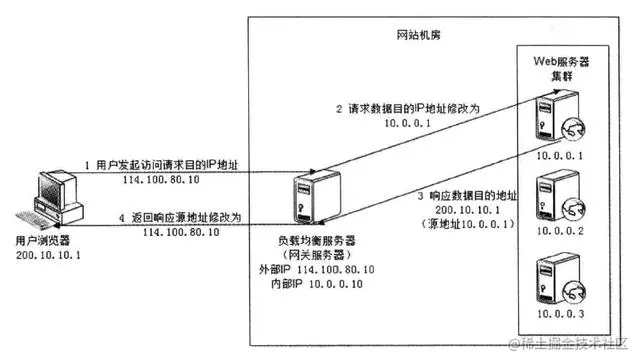 在网络层通过修改请求目标地址进行负载均衡。负载均衡服务器(网关服务器)在操作系统内核获取网络数据包,根据负载均衡算法计算得到一台真实 Web 服务器 10.0.0.1,然后将目的 IP 地址修改为 10.0.0.1,不需要通过用户进程。真实 Web 服务器处理完成后,响应数据包回到负载均衡服务器,负载均衡服务器再将数据包原地址修改为自身的 IP 地址(114.100.80.10)发送给浏览器。