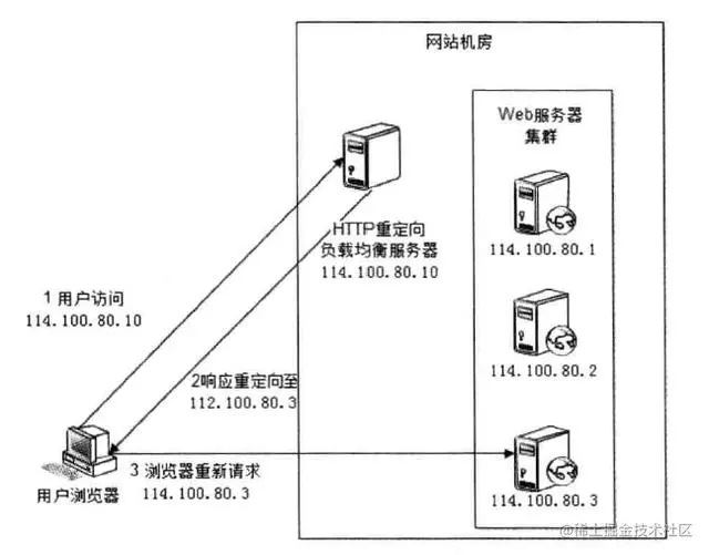 这种负载均衡方案的优点是比较简单。缺点是浏览器需要两次请求服务器才能完成一次访问,性能较差:重定向服务器自身的处理能力有可能成为瓶颈,整个集群的伸缩性规模有限;使用 HTTP 302 响应码重定向,可能使搜索引擎判断为 SEO 作弊,降低搜索排名。
