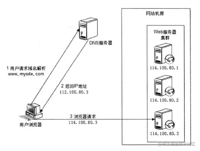 每次域名解析请求都会根据负载均衡算法计算一个不同的 IP 地址返回,这样 A 记录中配置的多个服务器就构成一个集群,并可以实现负载均衡。